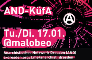 AND-KüfA Dienstag, 17.01.2023 🔪🔪 17 Uhr - gemeinsames Kochen 🎃🎃 19 Uhr - gemeinsames Essen ✨✨ 20 Uhr - Gruppenvorstellung - Anarchistischer Hörfunk @ malobeo, Kamenzer Str. 38, DD Du hast schon eine Weile Interesse am anarchistischen Netzwerk, jedoch bisher keine Gelegenheit gehabt mal vorbei zu schauen? Das trifft sich gut, denn wir haben Lust dich kennenzulernen. Das anarchistische Netzwerk Dresden organisiert ab Januar 2023 regelmäßige Küfa‘s, um Interessierte einzuladen, einen Austauschraum zu bieten und gleichzeitig schon bestehende Gruppen des…