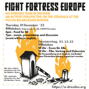We want to invite you for a meeting with people from the No Borders Team, an anarchist collective from Poland, working on the polish-belarusian border. (Deutsche Version Unten) Thursday, 1. December 2022 malobeo, Kamenzer Str. 38, 01099 Dresden 6pm – Food for All 7pm – movie, presentation and discussion – event will be in English We will talk about the situation in Poland in the past year. The north-eastern European migration route experienced a devastating renaissance late summer of 2021.…