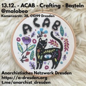 ACAB* – Crafting – Basteln Di./Tu., 13.12. @malobeo 🔪16:30 – Cooking / Gemeinsames Kochen 🍝19:00 – Eating / Essen / KüfA 🪄17:00 – lino printing/painting/sewing/ embroider - Drucken/Malen/Nähen/Sticken Anarchist Network Dresden invites you to the ACAB* – Crafting event. This Tuesday we want to do Lino printing and make patches by ourselves, sew and embroider and teach each other how to do that. We have different lino printing blocks and colors to print, but you can also cut a new…