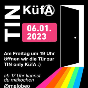 ++ Trans-Inter-Nonbinary KüfA ++ _ Freitag, 06.01.2023 🔪🔪 17 Uhr – gemeinsames Kochen | cooking 🌮🌮 19 Uhr – Essen | eating 🏴🏴 @malobeo, Kamenzer Str. 38 Dresden __ We are taking our space! Ihr seid alle eingeladen zur TIN*only-KüfA (Trans*inter*nonbinary) am 06.01.2023, 19:00 Uhr im @malobeo. Es wird leckeres veganes Essen geben und ganz viele neue connections. Wenn du einfach mal Lust hast, mit anderen TIN-Menschen abzuhängen, dich über Themen austauschen willst oder einfach nur Bock auf gutes Essen…