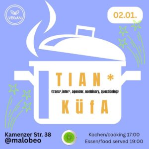 TIAN* only (trans*, inter*, agender, nonbinary) KüfA Fr., 05.12. 🧂17 Uhr – gemeinsames Kochen | cooking 🌮19 Uhr – Essen | eating 🏴 @malobeo, Kamenzer Str. 38, DD We are taking our space! Es wird leckeres veganes Essen geben. Wenn du einfach mal Lust hast, mit anderen TIAN* Menschen abzuhängen, dich über Themen austauschen willst oder einfach nur Bock auf gutes Essen hast: komm vorbei and bring your friends! 🏳️⚧️🏳️🌈 Wir freuen uns auf dich, lass uns chillen & uns…