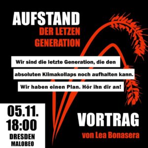 🌾Verzweifelt wegen der Klimakatastrophe?🌾 Du musst die klimaökologische Katastrophe nicht tatenlos geschehen lassen. Wir haben einen Plan, der das Potenzial hat, einen Wirbelwind zu entfachen. Und du kannst deine Entschlossenheit und deinen Mut in die Waagschale werfen. 💪Bist du bereit, bis zum Äußersten zu gehen?💪 ‼️Wir suchen Menschen, die bereit sind, wochenlang Widerstand zu leisten gegen den Klimakollaps!‼️ Komm zum Vortrag mit Lea Bonasera vom Hungerstreik 2021, um mehr zu erfahren: Fr, 05.11., Dresden (Malobeo), 18:00 Uhr Lea war im…