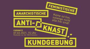 Wann: 07.03.2021 um 15 Uhr Wo: auf dem Parkplatz vor der JVA Chemnitz Anreise aus Dresden: 7. März um 12:30 Uhr vor dem Hauptbahnhof in Dresden (Wiener Platz) german – english below Knast ist ein Mittel des Staates, sozialen Problemen zu begegnen. Er soll dich „resozialisieren“. Du hast aber kaum Gelegenheit zur Selbstbestimmung und bist vom Rest der Gesellschaft isoliert. Jede*r Dritte landet nach Freilassung wieder dort, denn er hilft nicht Gefangenen, sondern der Herrschaftssicherung. Knast ist ein gewaltvoller und…
