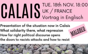CALAIS - UK/FRANCE ✊🏽 Tuesday 18th November 6pm @malobeo Kamenzer Str. 38, Dresden Presentation of the recent situation in Calais What solidarity looks like right now, what repression people are facing How far right political discourse opens doors to racist attacks and how to resist. Two activists from France and UK will share there experience.